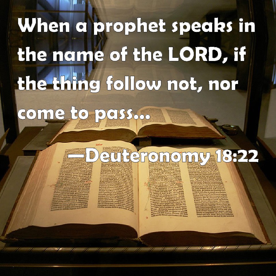 “20 But the prophet, which shall presume to speak a word in my name, which I have not commanded him to speak, or that shall speak in the name of other gods, even that prophet shall die.21 And if thou say in thine heart, How shall we know the word which the Lord hath not spoken?22 When a prophet speaketh in the name of the Lord, if the thing follow not, nor come to pass, that is the thing which the Lord hath not spoken, but the prophet hath spoken it presumptuously: thou shalt not be afraid of him.” – Deut. 18