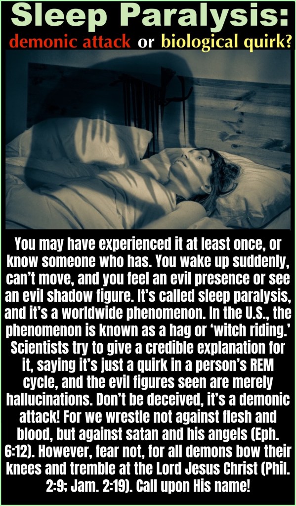 “You may have experienced it at least once, or know someone who has. You wake up suddenly, can’t move, and you feel an evil presence or see an evil shadow figure. It’s called sleep paralysis, and it’s a worldwide phenomenon. In the U.S., the phenomenon is known as a hag or ‘witch riding.’ Scientists try to give a credible explanation for it, saying it’s just a quirk in a person’s REM cycle, and the evil figures seen are merely hallucinations. Don’t be deceived, it’s a demonic attack! For we wrestle not against flesh and blood, but against satan and his angels (Eph. 6:12). However, fear not, for all demons bow their knees and tremble at the Lord Jesus Christ (Phil. 2:9; Jam. 2:19). Call upon His name!”