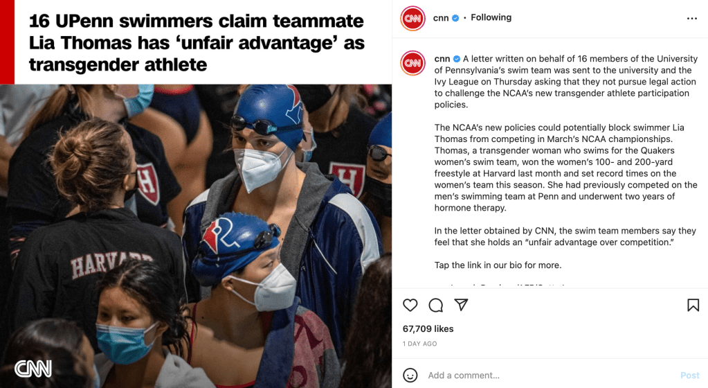 Indeed, the entire premise behind sex-specific competition in sports is the simple scientific reality that, in general, males are stronger, faster and more physically powerful than females (source).” Because of biology, “High school girls — as well as collegiate, amateur, and professional female athletes all over the world and in many sports — are being dominated by biological males (source).” One source reads, “A groundbreaking new study on transgender athletes has found trans women retain a 12% advantage in running tests even after taking hormones for two years to suppress their testosterone.” Another source reads something similar. Now, 23 trans women have won national or international competitions or championships (source).