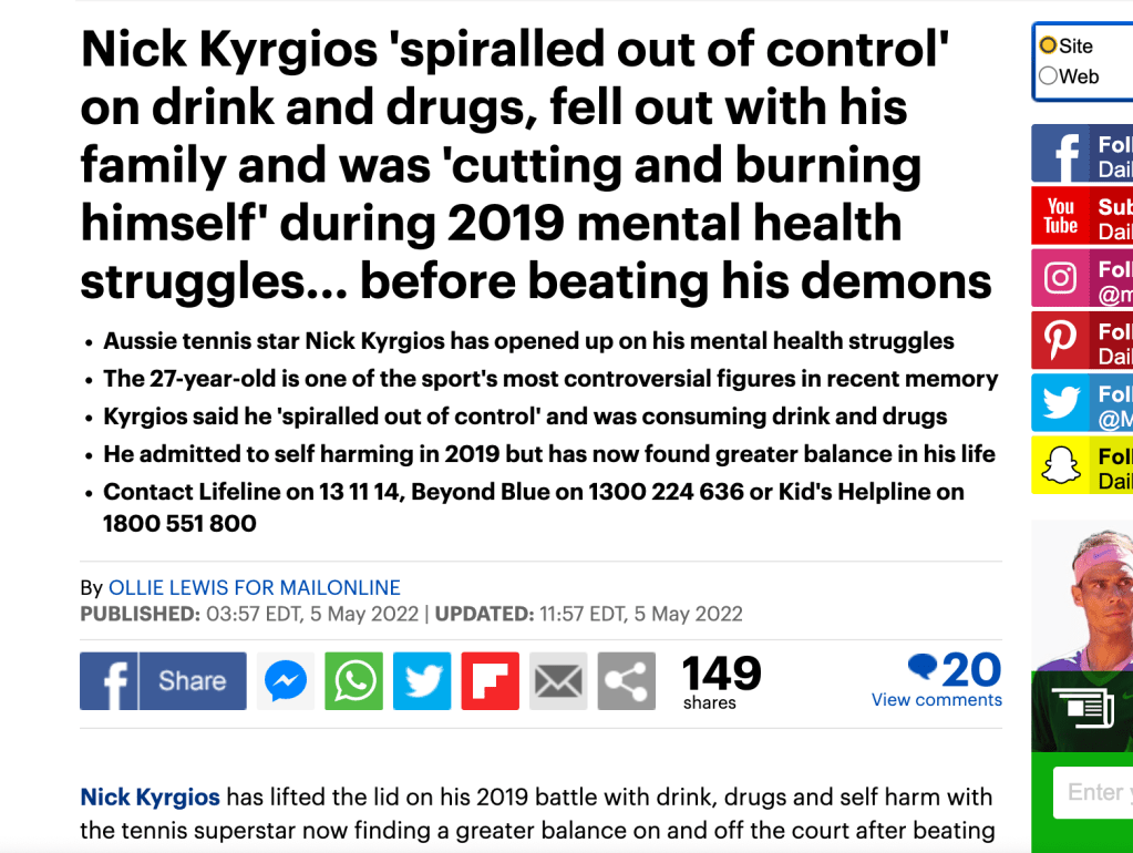 • Billie Eilish, who was exposed here, was involved in self-harming. She said she went “through a whole self-harming phase — we don’t have to go into it. But the gist of it was, I felt like I deserved to be in pain” (Source).