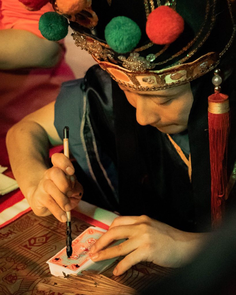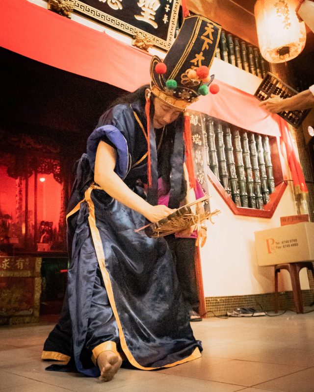 “He works with ‘Lei Zheng Zi Yuan Shuai’ (one of the five great thunder deities in Taoism) and ‘Li Ya Pek’ (one of the two fortune deities of the netherworld). ‘I went to temples to do ‘pua puey’— a form of divination—to confirm if it’s really the deities who are possessing my body,” he recollects.” Source