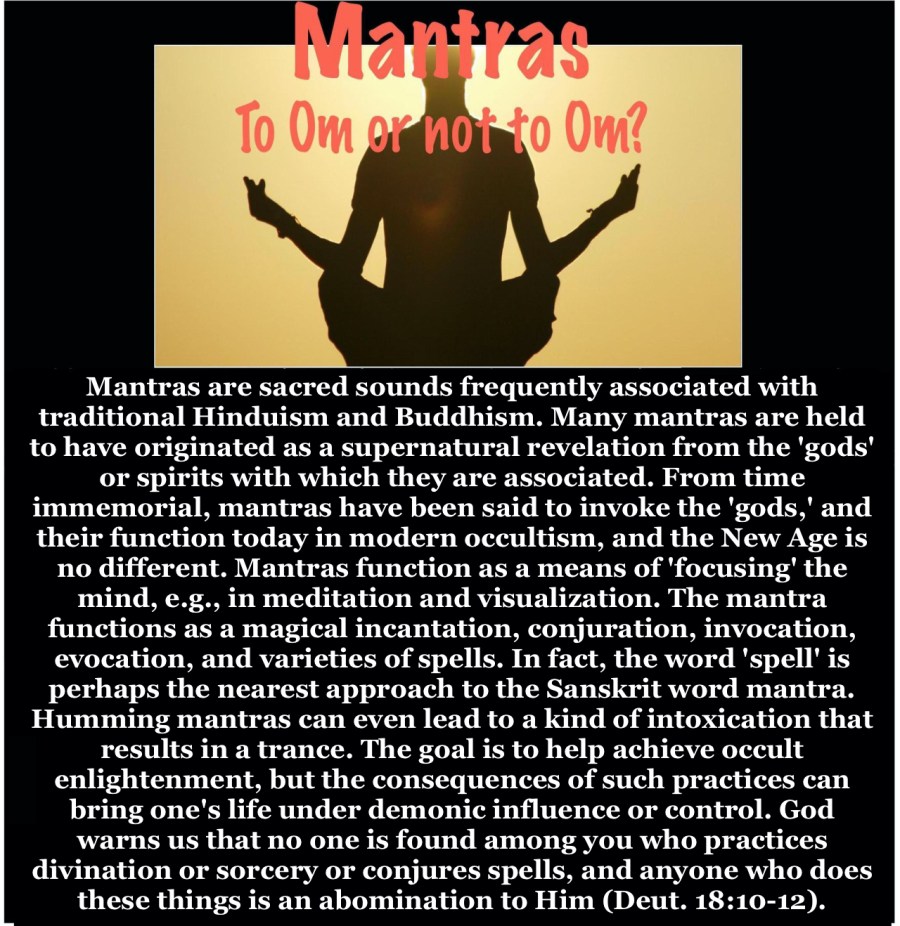 Source: Encyclopedia of New Age Beliefs "Mantras are sacred sounds frequently associated with traditional Hinduism and Buddhism. Many mantras are held to have originated as a supernatural revelation from the 'gods' or spirits with which they are associated. From time immemorial, mantras have been said to invoke the 'gods,' and their function today in modern …