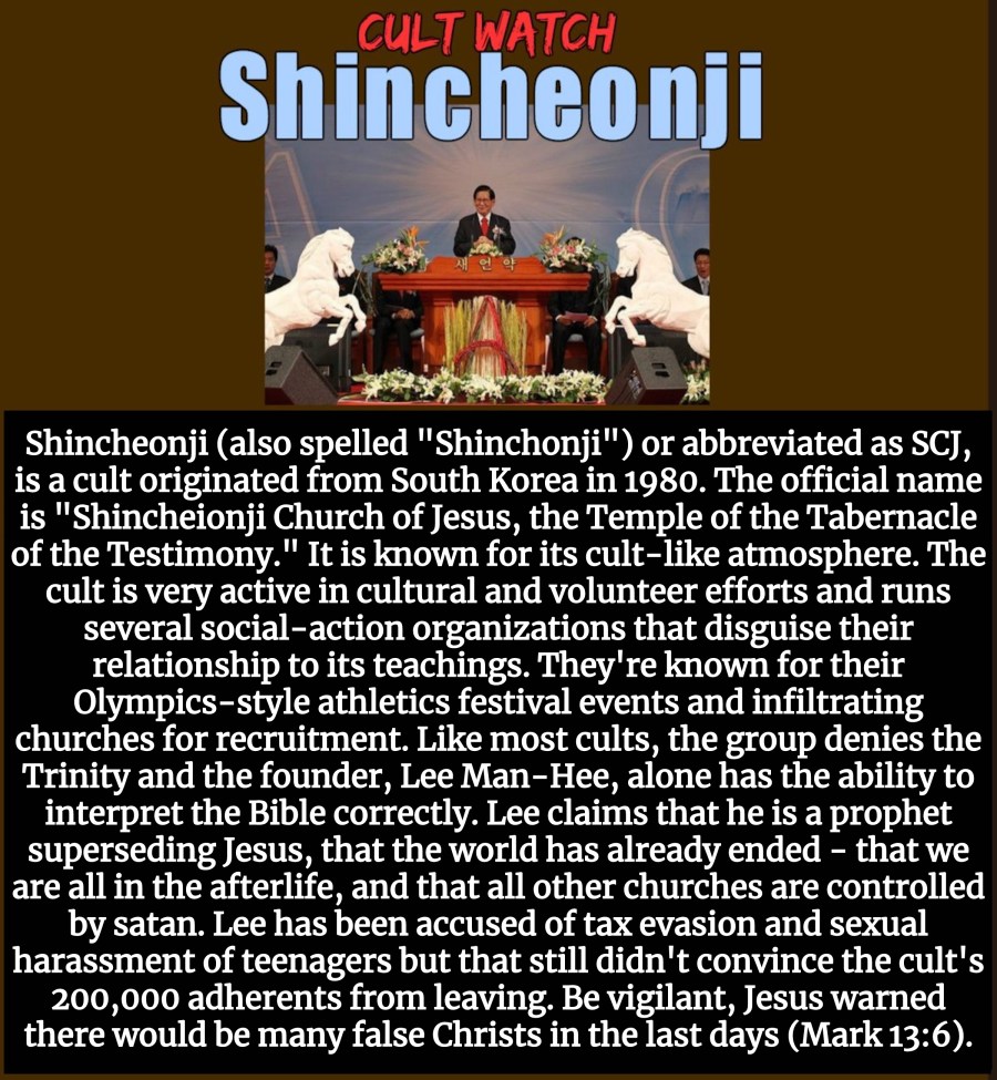 "Shincheonji (also spelled "Shinchonji") or abbreviated as SCJ, is a cult originated from South Korea in 1980. The official name is "Shincheionji Church of Jesus, the Temple of the Tabernacle of the Testimony." It is known for its cult-like atmosphere. The cult is very active in cultural and volunteer efforts and runs several social-action organizations …