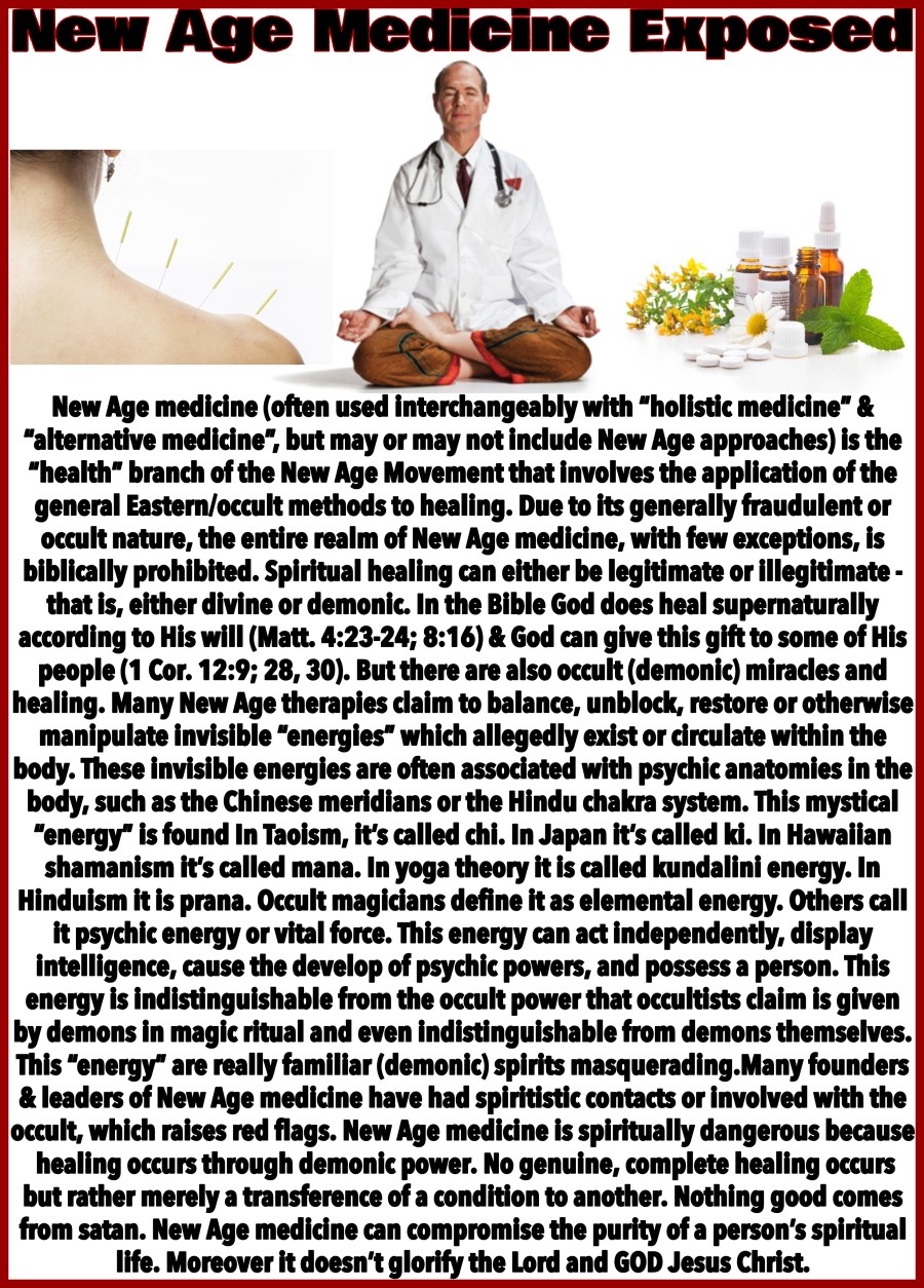 "Test all things; hold fast what is good." - Thess. 5:21 "New Age medicine (often used interchangeably with “holistic medicine” & “alternative medicine”, but may or may not include New Age approaches) is the “health” branch of the New Age Movement that involves the application of the general Eastern/occult methods to healing. Due to its …