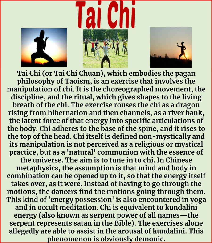 "Tai Chi (or Tai Chi Chuan), which embodies the pagan philosophy of Taoism, is an exercise that involves the manipulation of chi. It is the choreographed movement, the discipline, and the ritual, which gives shapes to the living breath of the chi. The exercise rouses the chi as a dragon rising from hibernation and then …