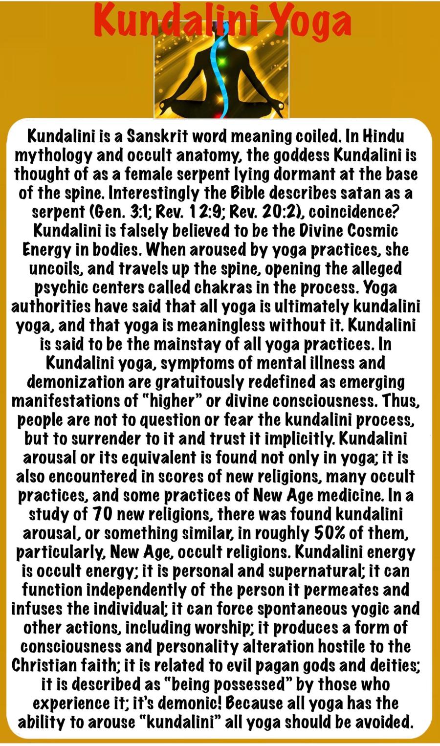 Source: Encyclopedia of New Age Beliefs "Kundalini is a Sanskrit word meaning coiled. In Hindu mythology and occult anatomy, the goddess Kundalini is thought of as a female serpent lying dormant at the base of the spine. Interestingly the Bible describes satan as a serpent (Gen. 3:1; Rev. 12:9; Rev. 20:2), coincidence? Kundalini is falsely …